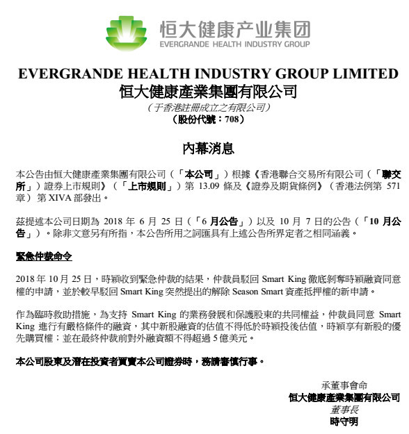 恒大健康公告称,仲裁员驳回Smart King(FF公司实体)彻底剥夺时颖融资同意权的申请,并于较早驳回Smart King突然提出的解除Season Smart资产抵押权的新申请。